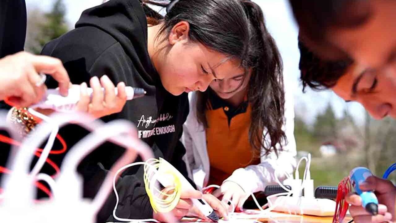 Düzce Belediyesi Bilim Merkezi ve Çocuk Üniversitesi iş birliğiyle düzenlenen etkinlikte 6 farklı atölye kuruldu. 3D kalemle Türk bayrağı rozeti yapan öğrenciler, geometri tahtasında şekiller oluşturdu.