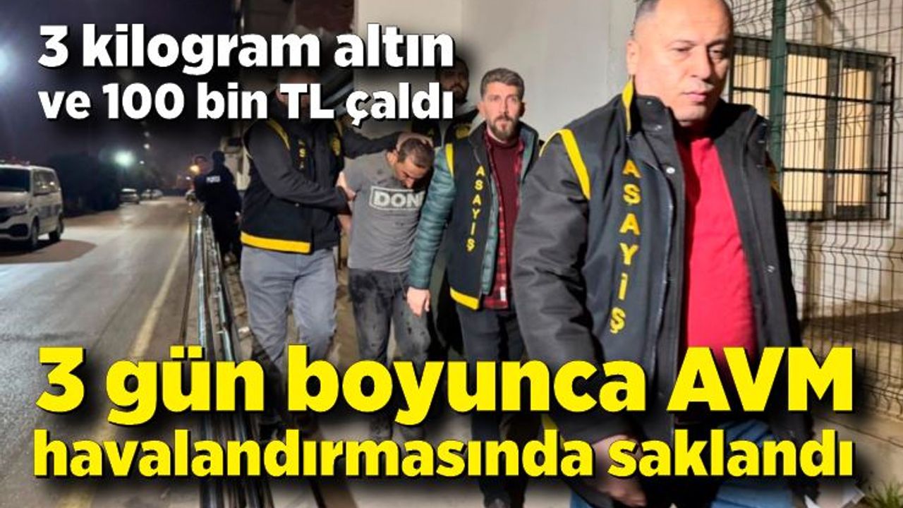 Adana’da havalandırmadan AVM’ye girip kuyumcudan 3 kilogram altın ve 100 bin TL çalan hırsız, havalandırmadan çıkıp kaçmaya çalıştığı sırada yakalandı. Şahsın 3 gün boyunca AVM'nin havalandırma boşluğunda saklandığı tespit edildi.