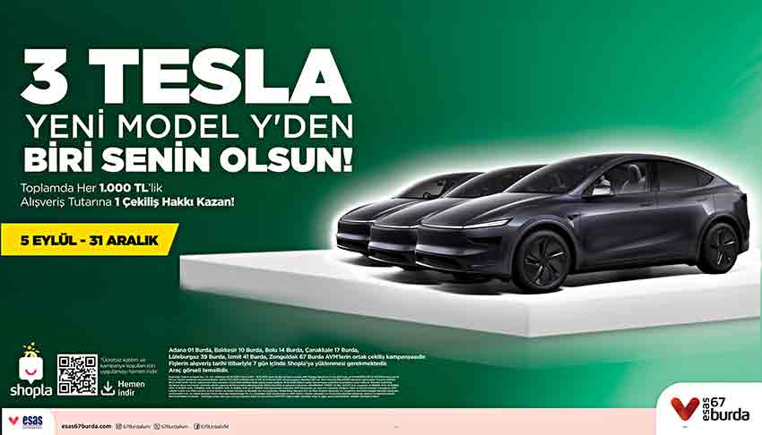 Türkiye’nin önde gelen ticari gayrimenkul yatırım şirketlerinden Esas Gayrimenkul tarafından Zonguldak’ta hayata geçirilen 67 Burda AVM’de çekiliş heyecanı başlıyor. Toplam 3 adet Tesla Yeni Model Y otomobil kazandıracak çekiliş kampanyası, 5 Eylül-31 Aralık 2025 tarihleri arasında Esas Gayrimenkul’ün portföyünde yer alan 7 Burda AVM’de ortak çekiliş olarak gerçekleştirilecek. Çekiliş kampanyası kapsamında; 67 Burda AVM ziyaretçileri, kampanya döneminde AVM’de yer alan mağazalardan yapacakları her 1.000 TL’lik alışveriş için 1 çekiliş hakkı kazanacak.