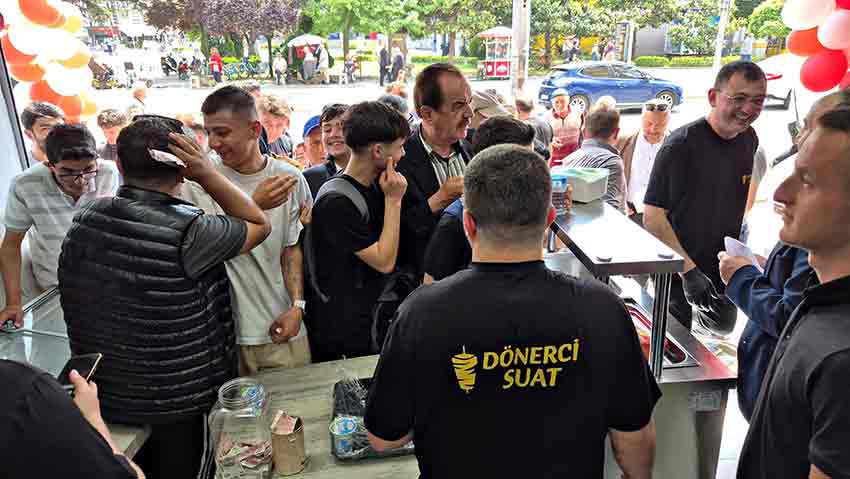 İşletme sahibi Fatih Kerim Cab, açılışa özel herkes dönerden yesin diye 1 TL’ye döner ayran sattıklarını belirterek, "Döner ayran 1 TL içine birde sevgimizi katıyoruz. İnşallah ilerleyen zamanlarda yine yapacağız. Vatandaşlardan gelen talepti. Bizde yaptık. Yoğun bir kalabalık var. Yetiştirmekte zorlanıyoruz. Aslında daha tedarikli başladık. Öncesinde hazırlıklarımızı yapmıştık. Ama yine yetişmedi" dedi.