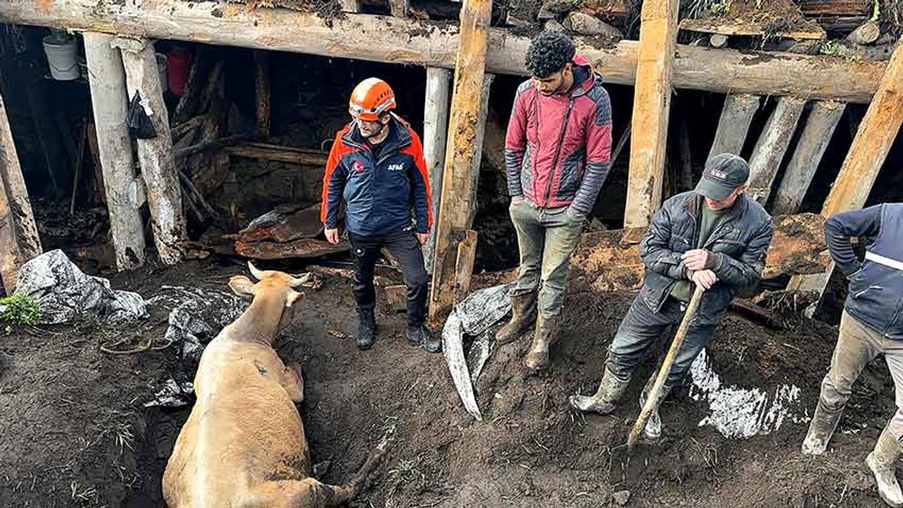 Ardahan'ın Göle ilçesinde çöken ahırda mahsur kalan 19 inekten 3'ü öldü, diğerleri kurtarıldı.