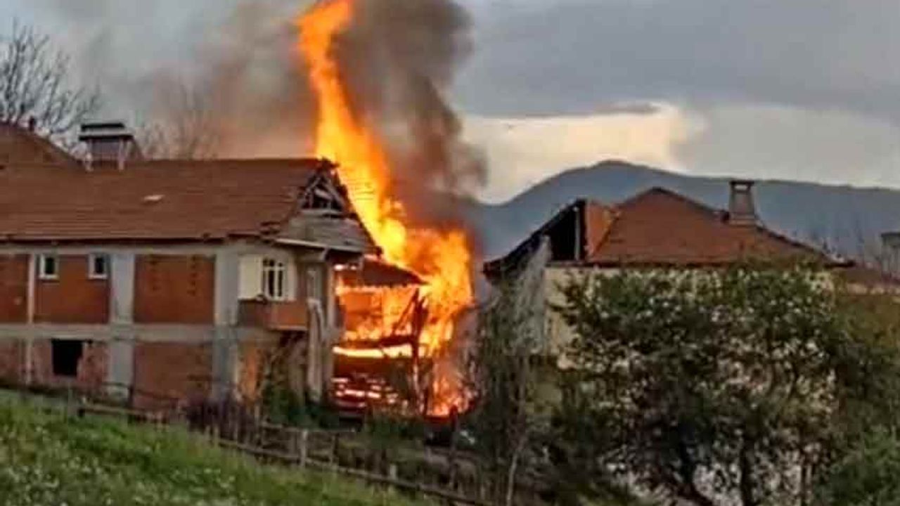 Düzce'nin Yığılca ilçesinde ahşap evde çıkan yangın, park halindeki traktöre de sıçradı. Yangın, ekiplerin müdahalesiyle söndürüldü.