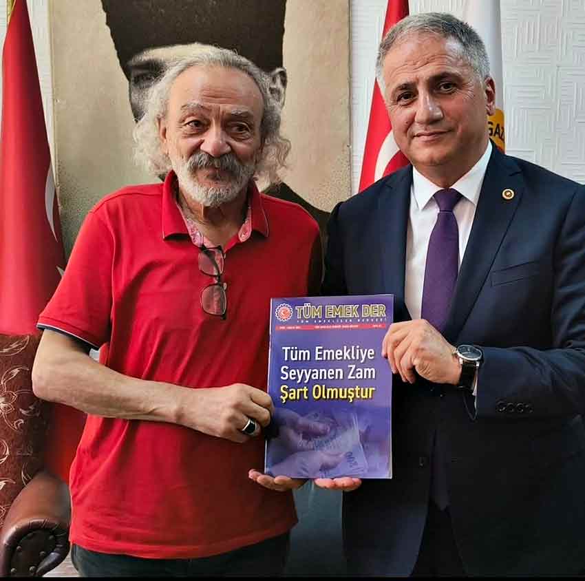 Sayın Bozkurt'a, kapağında 'TÜM EMEKLİYE SEYYANEN ZAM ŞART OLMUŞTUR' yazan, TÜM EMEK DER Dergisi taktım ettik.”