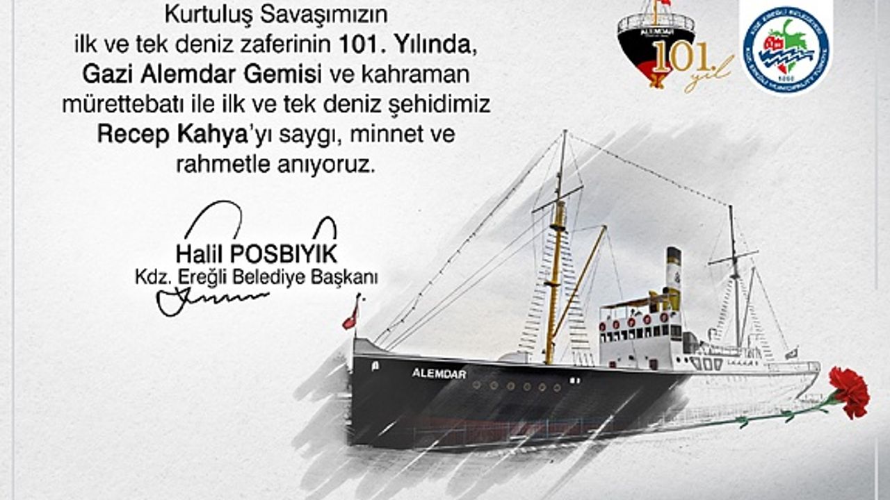 Zonguldak'ın Ereğli ilçe Belediye Başkanı Halil Posbıyık, Kurtuluş Savaşımızın ilk ve tek deniz zaferinin 101’inci yıldönümünde mesaj yayımlayarak “Alemdar Gemisi bağımsızlık ve özgürlük mücadelesinin simgesidir” dedi.