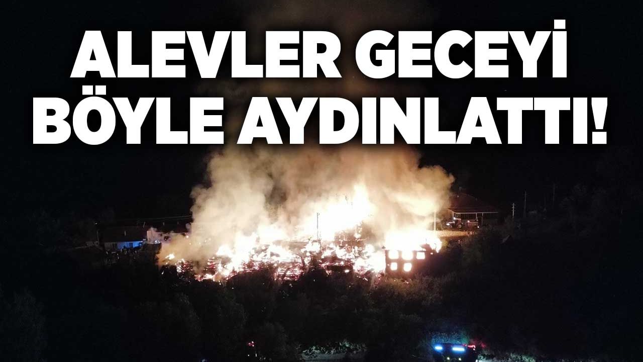 Toplamda 12 yapının alevlere teslim olduğu yangın, dronla havadan görüntülendi. Köyün havadan çekilen görüntülerinde alevlerin geceyi aydınlattığı görüldü.