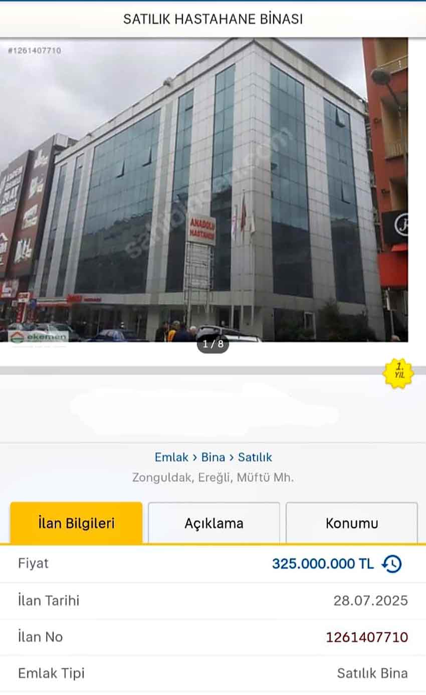 Ereğli ilçesinde uzun yıllar sağlık hizmeti veren Anadolu Hastanesi binası satışa çıkarıldı.