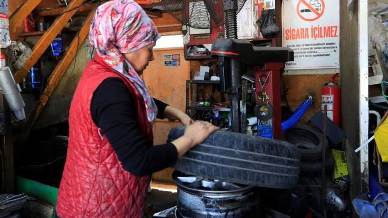 Muratpaşa ilçesinde eşiyle birlikte yaklaşık 30 yıldır lastik tamirhanesi işleten Mümine Kökçe, kadınların zorlu mesleklerde de başarılı olabileceğini gösteriyor.
