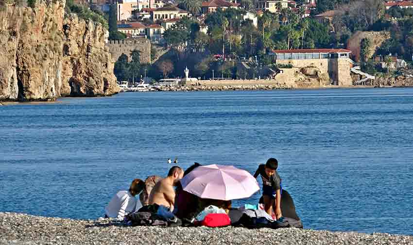 Türkiye'nin birçok kenti kar ve yağışlı havanın etkisi altındayken, Antalya'da aralık ayında yazı aratmayan görüntüler yaşandı. Termometrelerin gece 8, gündüz ise 24 dereceyi gösterdiği kentte nem oranı yüze 52, deniz suyu sıcaklığı ise 21 derece ölçüldü. Güzel havayı fırsat bilenlerin uğrak noktası olan dünyaca ünlü Konyaaltı Sahili'nde vatandaşlar ile yerleşik yabancılar, Beydağları'nın karlı manzarasında güneş ve denizin tadını çıkardı. Güzel havada bazı vatandaşlar yürüyüş yapmayı, bazıları da balık tutmayı tercih etti.