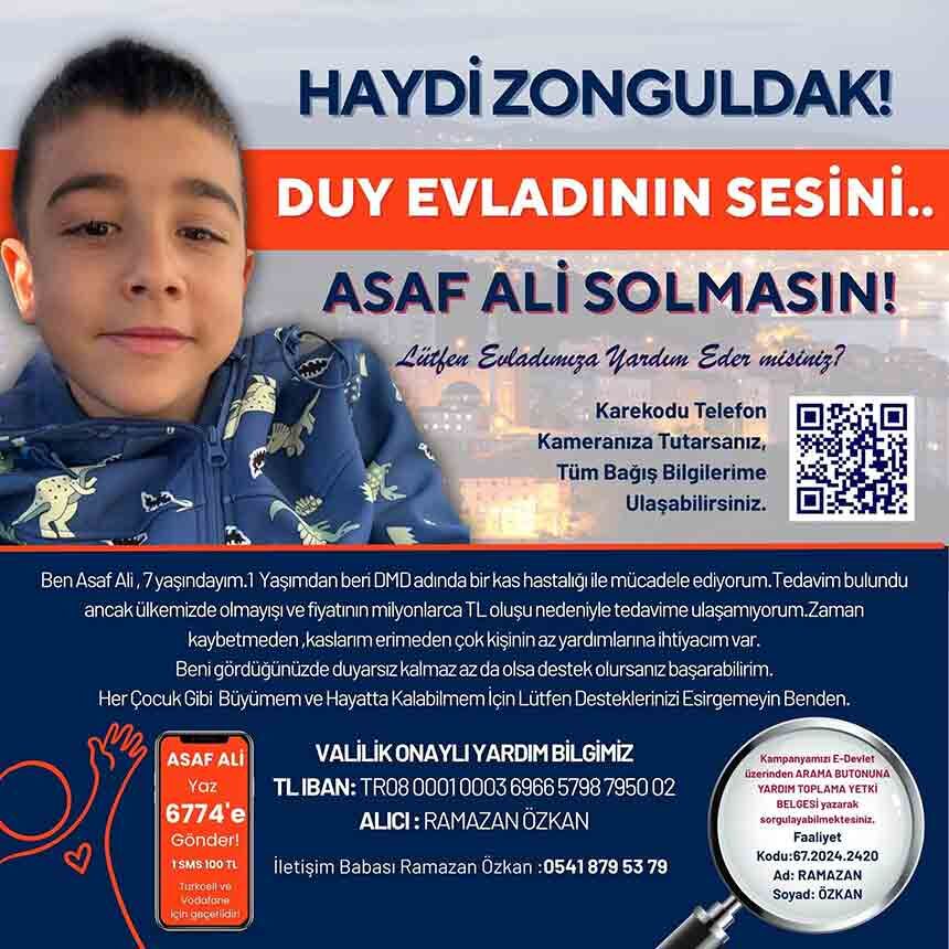 Çaycuma ve Çevre Köylerini Kalkındırma Derneği Başkanı Savaş Çiloğlu, Duchenne Musküler Distrofi (DMD) hastası 7,5 yaşındaki Asaf Ali Özkan için yardım çağrısında bulundu. Çiloğlu, kampanyanın %90 seviyesine ulaştığını belirterek kalan son %10 için toplumun desteğini istedi.