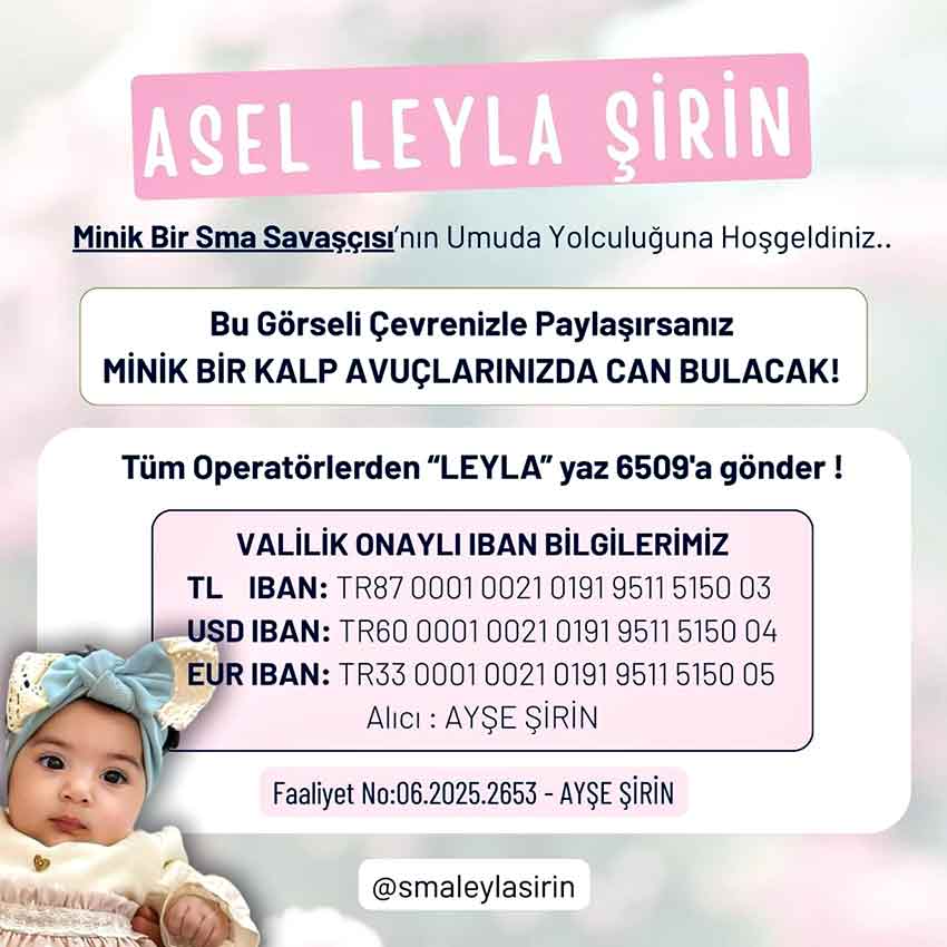 Zonguldak’ın Ereğli ilçesine bağlı Gülüç beldesinde yaşayan minik Asel Leyla Şirin, henüz bebek yaşta hayati bir mücadele veriyor. SMA Tip 1 (Spinal Musküler Atrofi) hastalığına yakalanan Asel bebek, yaşama tutunmak için zamanla yarışıyor. Hayatta kalabilmesi ve sağlığına kavuşabilmesi için gerekli olan gen tedavisi oldukça pahalı; ancak Asel için başlatılan kampanya, onu hayata bağlayacak umut köprüsünü kurmayı hedefliyor.