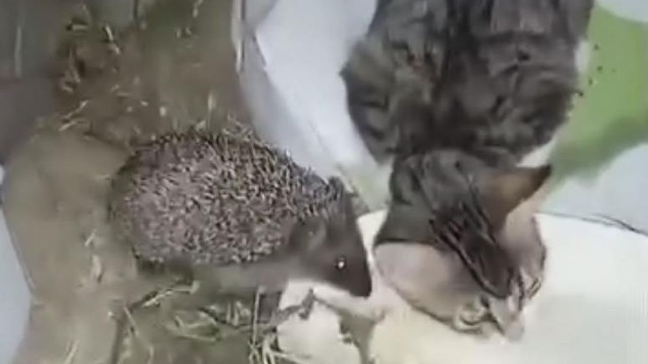 Görüntülerde kirpinin yavru kedilerle birlikte herhangi bir tedirginlik yaşamadan yemek yediği anlar yer alıyor.