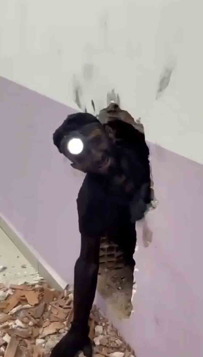Refleksi sayesinde birinci katta kendini sıkıştırarak durabilen Taşkın’ın durumu ekip arkadaşlarına bildirildi. Olay yerine gelen çalışma arkadaşları, birinci kattaki duvarı kırarak ustayı bulunduğu yerden çıkardı.