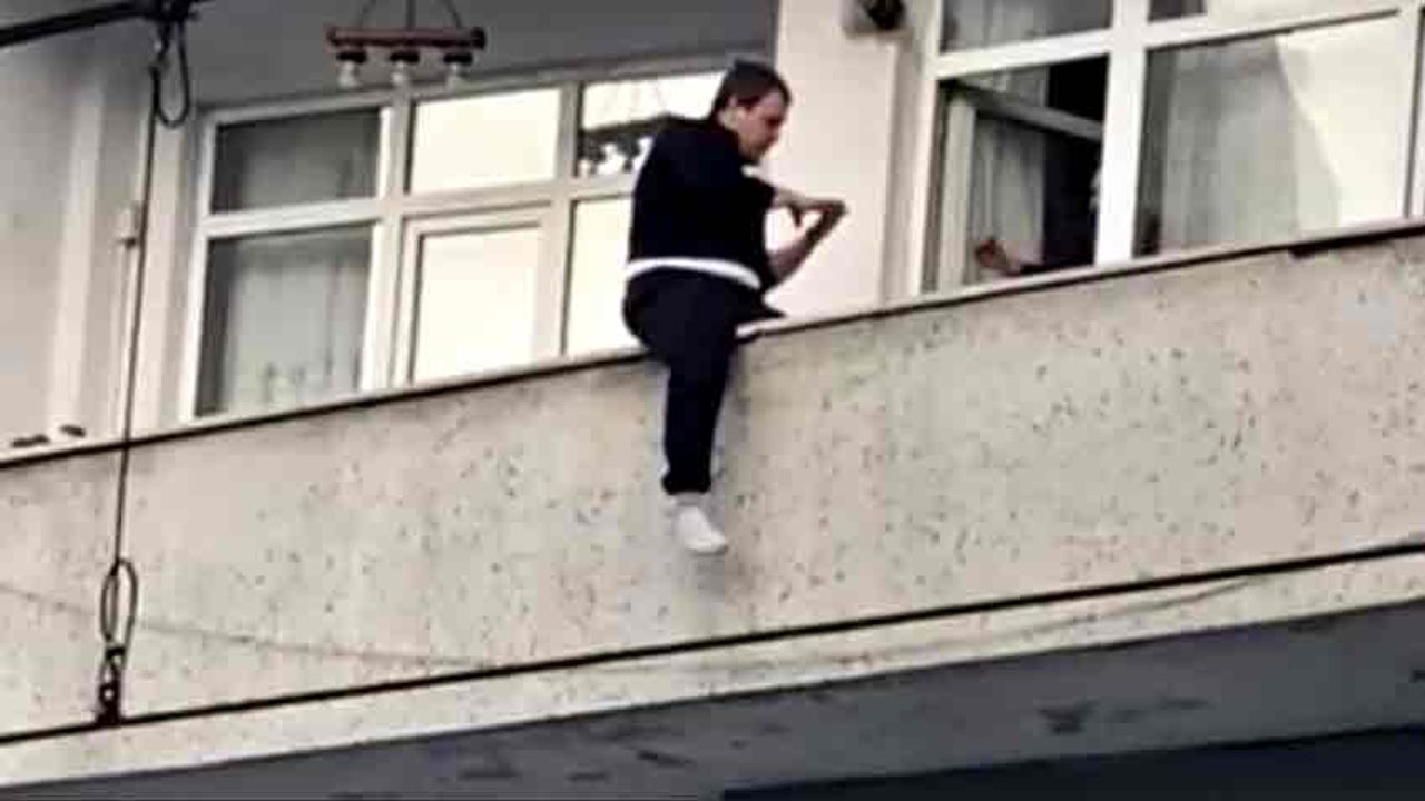 Evde ailesiyle tartıştığı öğrenilen ve elinden yaralı olduğu görülen şahıs, "Yeter, bıktım bu hayattan" şeklinde ifadeler kullandı. Bir süre sonra evde bulunan bir kişi tarafından ikna edilen şahıs balkonda inerken, yaşananlar cep telefonu kamerasıyla kaydedildi.