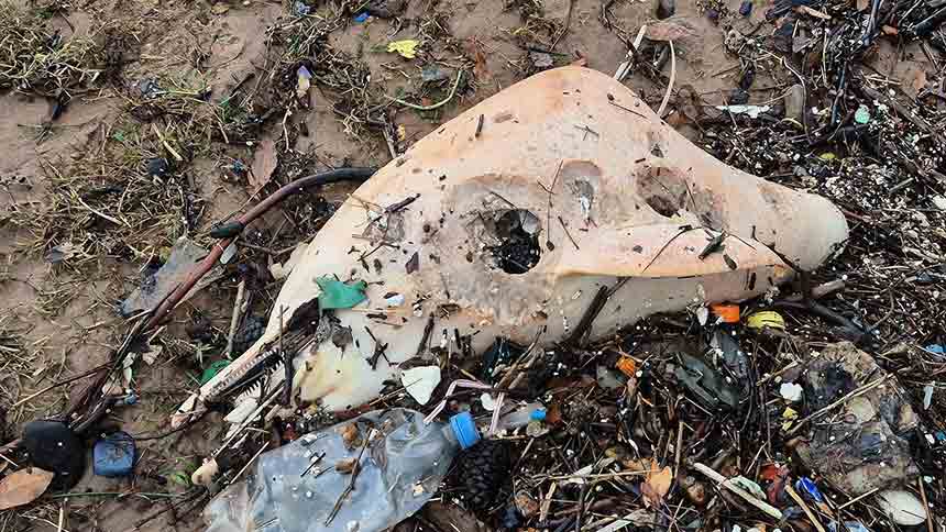 Sahile vuran yunus balığı kalıntısında dişleri ve çenesinin bulunduğu kafatası ile üzerindeki yağ tabası yer aldı. Görgü tanıkları kalıntının yetişkin bir yunusa ait olabileceğini belirtti.