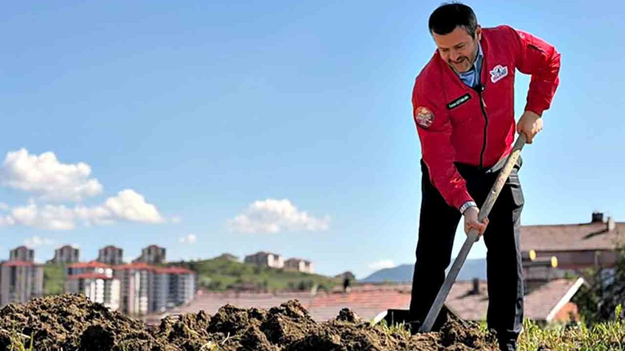 Fevzi Çakmak Mahallesi’nde bir vatandaşla karşılaşan Çetinkaya, sohbet sırasında dalından kopardığı bademi yedi. Bunun üzerine esprili bir şekilde “karşılığını vermek” isteyen Başkan, kürek alarak bahçede toprağı belledi.