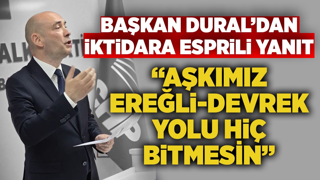 CHP İl Başkanı Devrim Dural, parti binasında basın toplantısı düzenleyerek gündeme dair açıklamalarda bulundu. AK Parti iktidarının Zonguldak'ta 23 yıldır birçok projeyi bitiremediğini ve hala devam et dedi belirterek Aşkımız Ereğli Devrek yolu gibi hiç bitmesin" diyerek esprili bir şekilde karşılık verdi.
