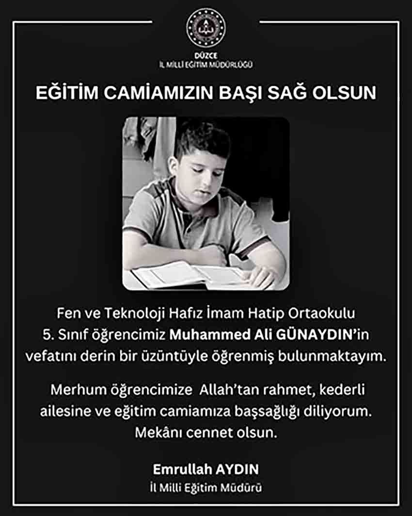 Düzce Milli Eğitim Müdürlüğü hayatını kaybeden öğrenci için taziye mesajı yayınladı. Mesajında "Eğitim camiamızın başı sağ olsun. Fen ve Teknoloji Hafız İmam Hatip Ortaokulu 5. sınıf öğrencimiz Muhammed Ali Günaydın’ı kaybetmenin derin üzüntüsü içindeyiz. Merhum öğrencimize Allah’tan rahmet, ailesine ve eğitim camiamıza başsağlığı diliyoruz. Mekanı cennet olsun" denildi.