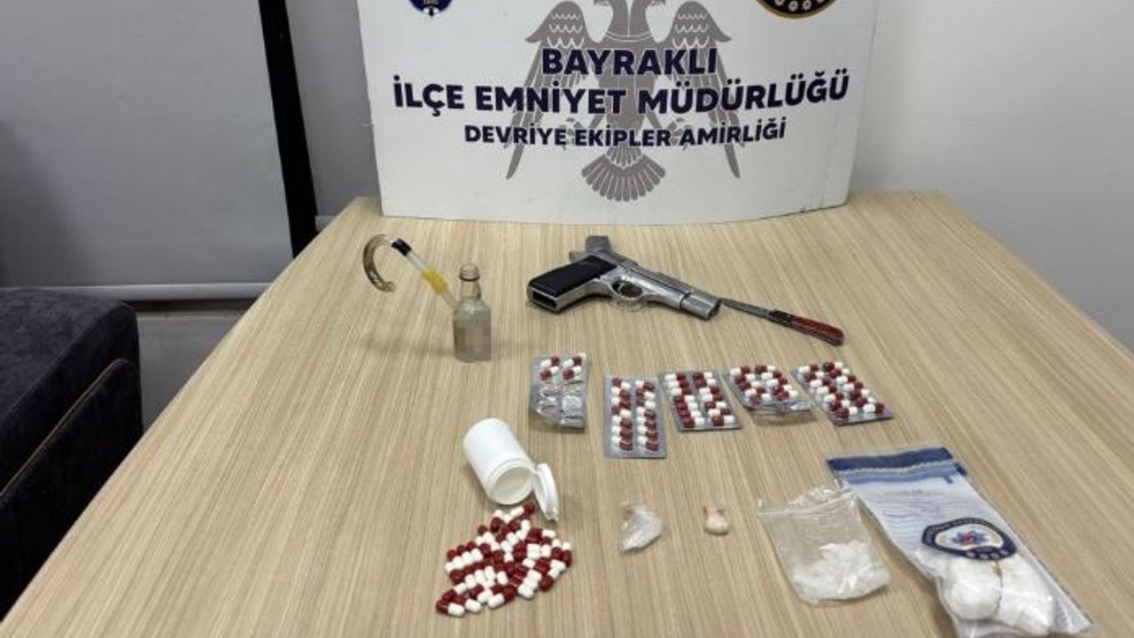 Bayraklı İlçe Emniyet Müdürlüğü Devriye Ekipler Amirliğine bağlı ekipler, dün akşam saat 22:50 civarında, 2118 Sokak üzerinde park halindeki Tofaş marka araç çevresinde şüpheli hareketlerde bulunan 3 kişiden şüphelendi. Ekipler, şüphelilere yaklaştığında motosiklet sürücüsü hızla olay yerinden uzaklaştı. Yapılan inceleme sonucu, kaçan motosiklet sürücüsünün uyuşturucu suçlarından sabıkalı O.D. olduğu belirlendi. Araçtaki şahıslara yapılan aramada ise 45,1 gram metamfetamin maddesi bulundu ve maddelerin O.D.'den alındığı tespit edildi. Bunun üzerine O.D.'nin evine savcılıktan alınan talimat sonucu operasyon gerçekleştirildi. Evde ve müştemilatında yapılan aramalarda, 1 ruhsatsız tabanca, 93 adet uyuşturucu hap, 14,4 gram metamfetamin, 1 adet bong düzeneği, 7 bin 835 TL nakit para ve bir adet bıçak ele geçirildi.