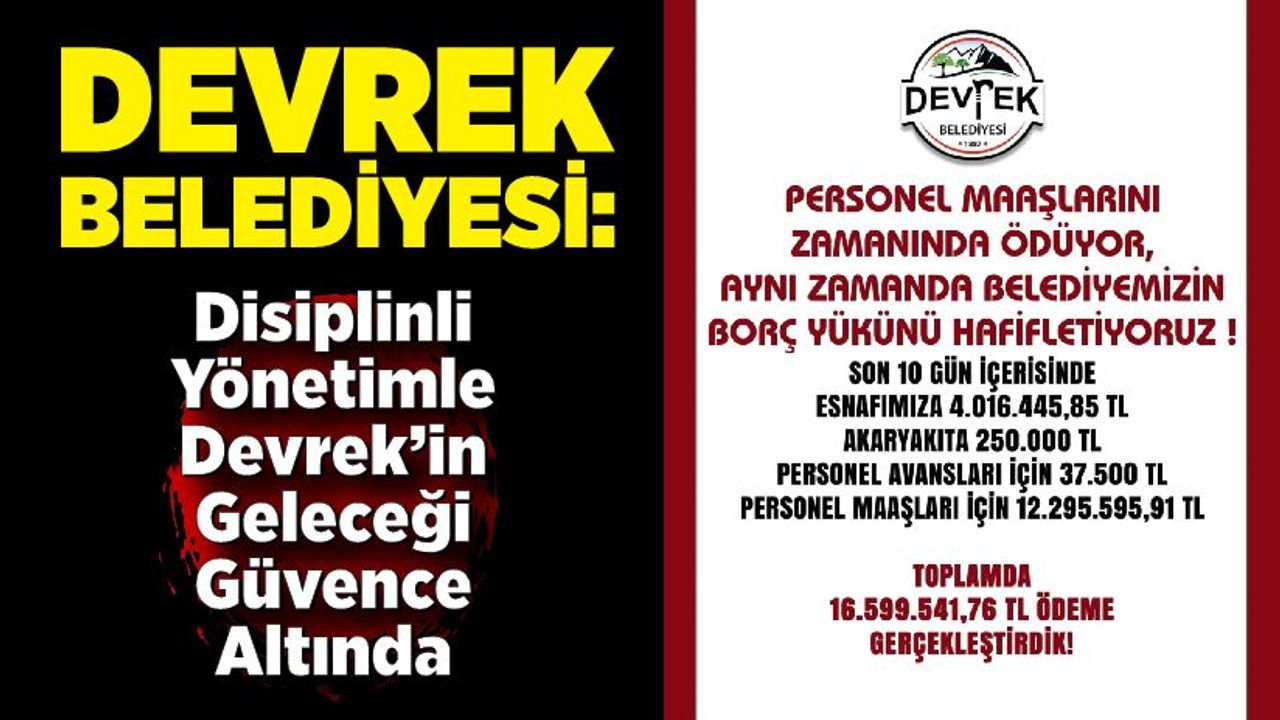 “Devrek Belediyesi olarak personel maaşlarını zamanında ve eksiksiz ödüyor, aynı zamanda belediyemizin borç yükünü her geçen gün azaltıyoruz. Disiplinli mali yönetim anlayışımızla hem çalışanlarımızın emeğine sahip çıkıyor hem de Devrek’in geleceğini güvence altına alıyoruz”