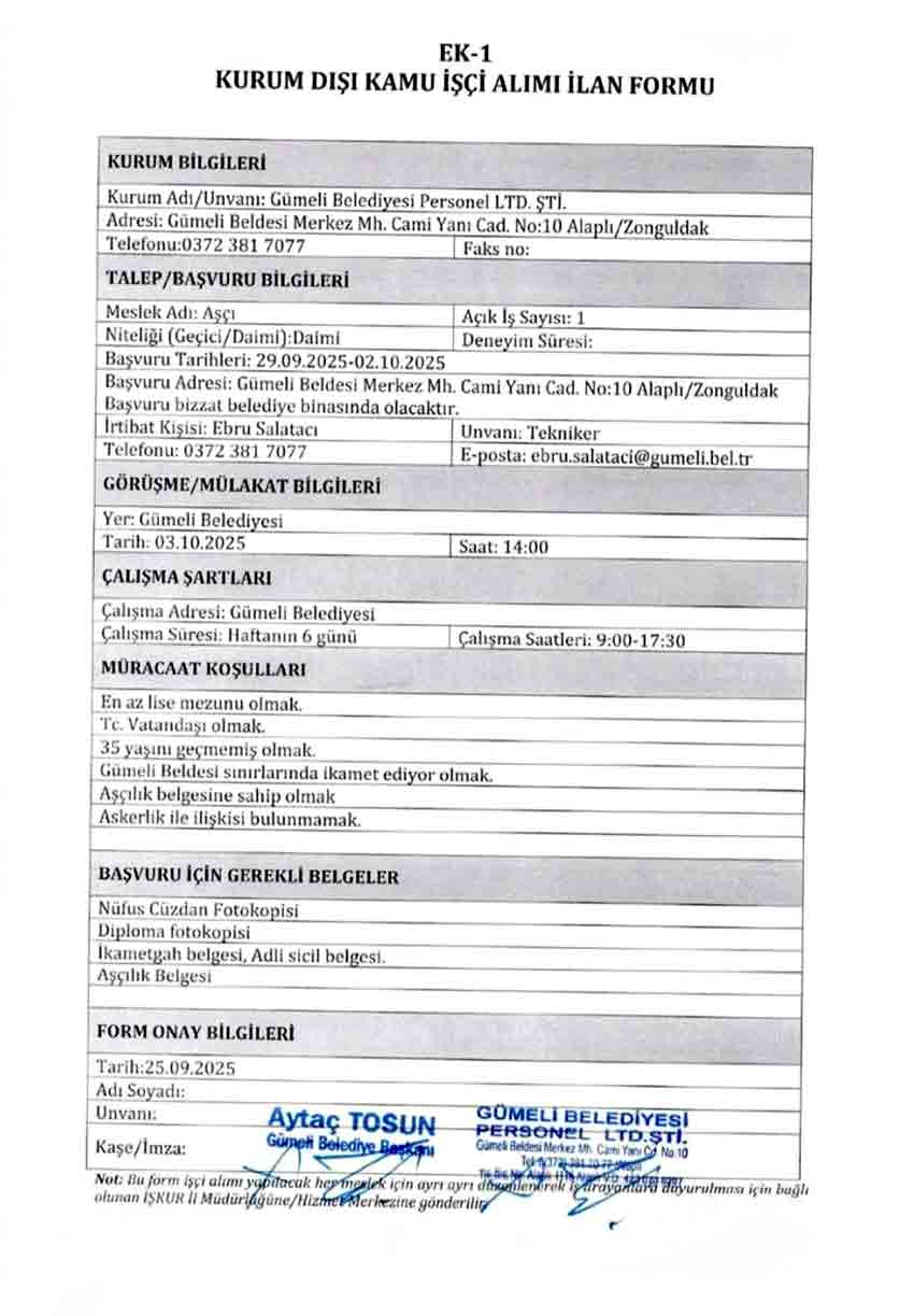 Zonguldak’ın Alaplı ilçesine bağlı Gümeli Belediyesi, İŞKUR aracılığıyla 1 daimi aşçı alımı yapacak. Belediyeden yapılan açıklamada, başvuruların 29 Eylül - 2 Ekim 2025 tarihleri arasında şahsen belediyeye yapılacağı belirtildi.