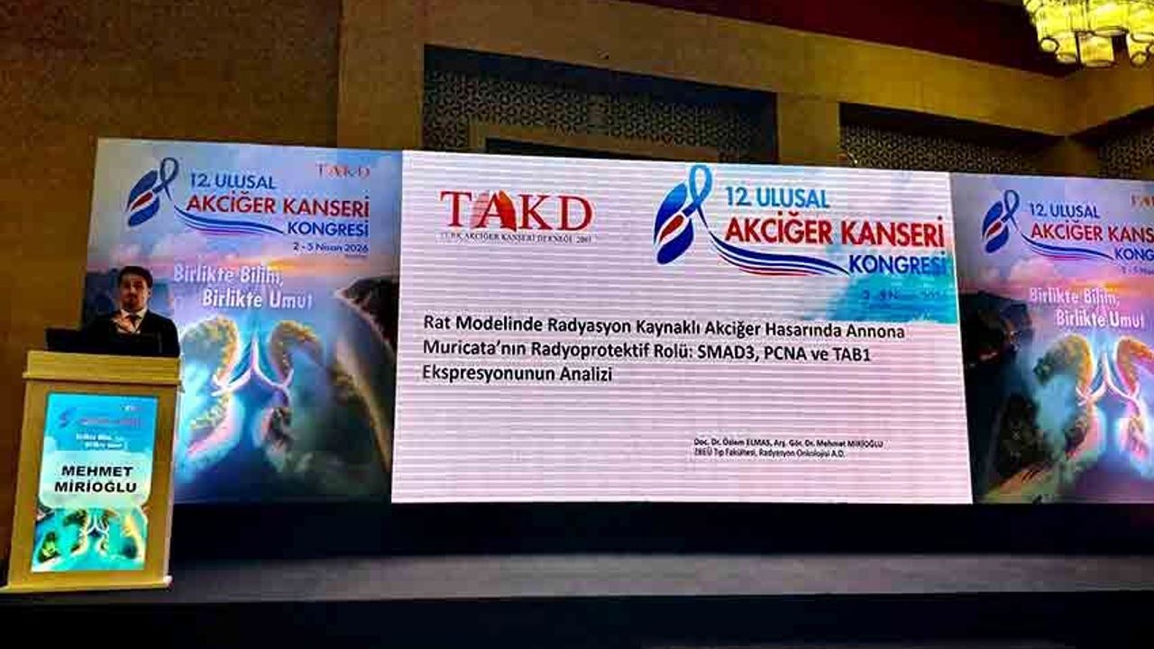 Türk Akciğer Kanseri tarafından 2-5 Nisan 2026 tarihinde Antalya’da düzenlenen 12. Ulusal Akciğer Kanseri Kongresi’nde BEUN Tıp Fakültesi Araştırma Görevlisi Dr. Mehmet Mirioğlu “Rat Modelinde Radyasyon Kaynaklı Akciğer Hasarında Annona Muricata’nın Radyoprotektif Rolü: SMAD3, PCNA ve TAB1 Ekspresyonunun Analizi” başlıklı bilimsel çalışması ile katılım sağladı. Kongrede yapılan değerlendirmeler sonucunda Dr. Mirioğlu’nun çalışması “En İyi Sözel Bildiri Birincilik Ödülü”ne layık görüldü.