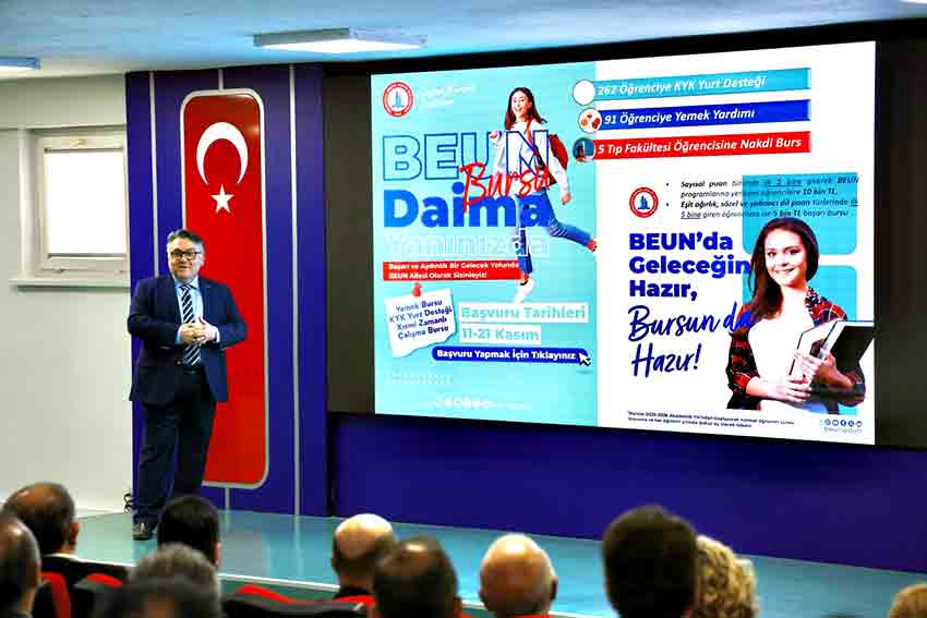 Uluslararasılaşma alanında yüksek lisans ve doktora öğrenci sayılarında önemli artışlar sağlandığını; Erasmus+ anlaşmalarının 136’dan 267’ye, iş birliği yapılan ülke sayısının ise 22’den 43’e yükseldiğini ifade etti. Sürdürülebilirlik çalışmaları kapsamında Yeşil Çatı, GES projeleri ve TÜRKPANET tescilli uygulamalardan bahsetti. Öğrencilerin ulusal ve uluslararası spor şampiyonlukları, akademik ödülleri ve Ar-Ge yarışmalarındaki başarılarıyla BEUN’un adını gururla temsil ettiğini vurguladı.