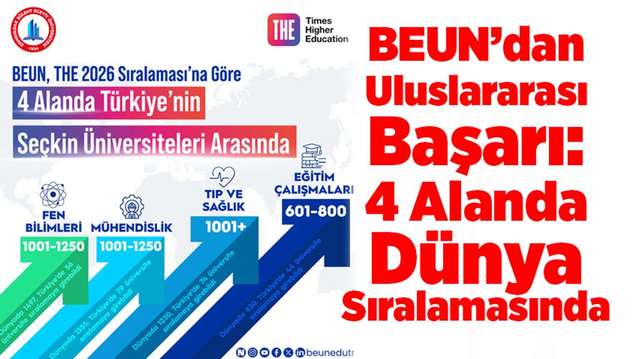Zonguldak Bülent Ecevit Üniversitesi, dünyanın saygın üniversiteleri arasında yer alma hedefi doğrultusunda sürdürdüğü nitelikli, planlı ve sürdürülebilir akademik çalışmalarının karşılığını, uluslararası değerlendirme kuruluşlarının listelerinde istikrarlı biçimde yer alarak almaya devam ediyor. BEUN, 2025 yılında olduğu gibi 2026 yılında da “Tıp ve Sağlık”, “Mühendislik”, “Fen Bilimleri” ve “Eğitim Çalışmaları” alanlarında THE sıralamalarında yer alarak araştırma ve yenilik odaklı vizyonunu bir kez daha tescilledi.