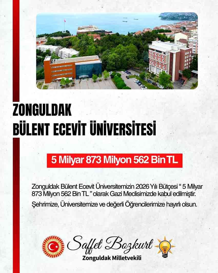 AK Parti Zonguldak Milletvekili Saffet Bozkurt, üniversitenin 2026 yılı bütçesinin 5 milyar 873 milyon 562 bin TL olarak Gazi Meclis’te kabul edildiğini açıkladı.