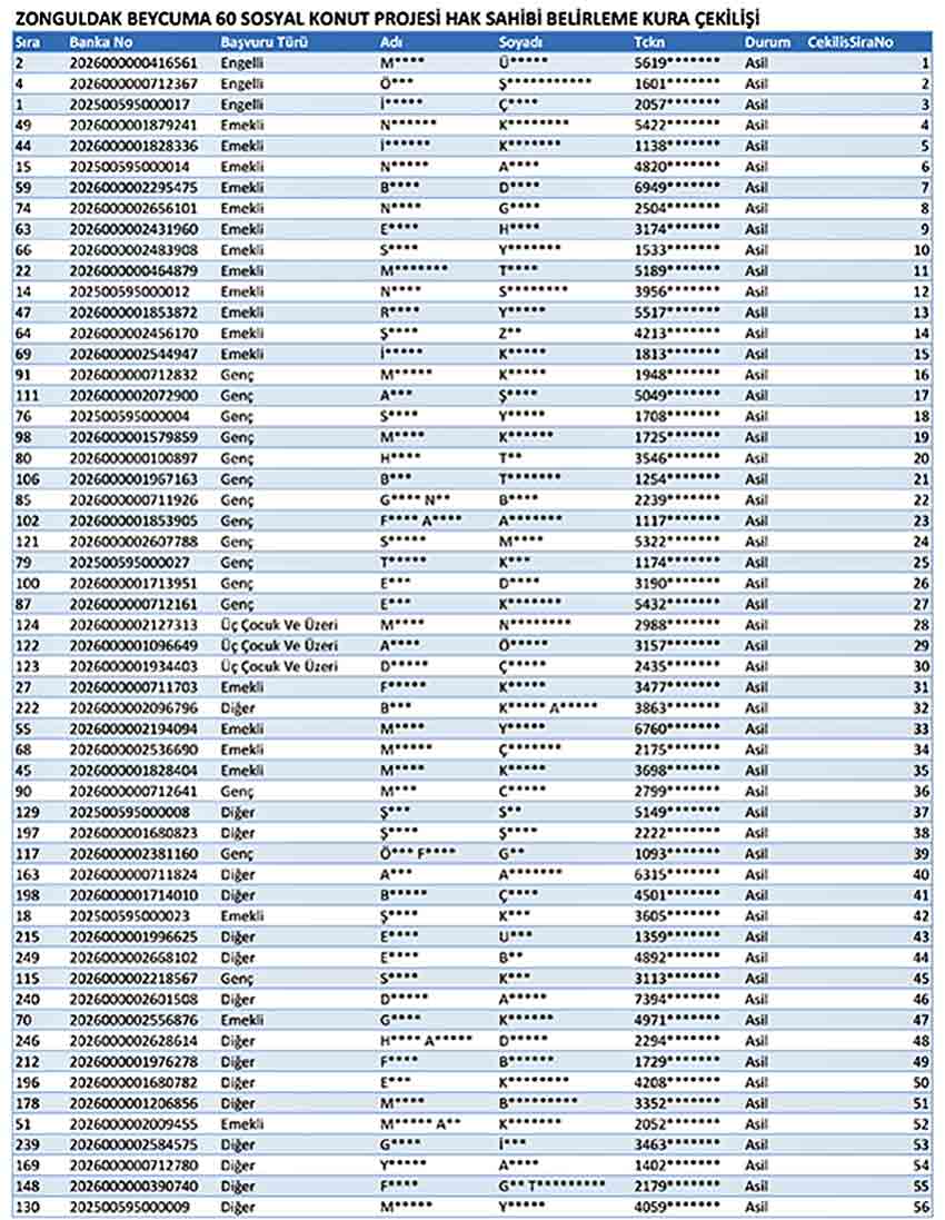 Gerçekleştirilen kura çekiminde BEYCUMA TOKİ HAK SAHİPLERİ LİSTESİ