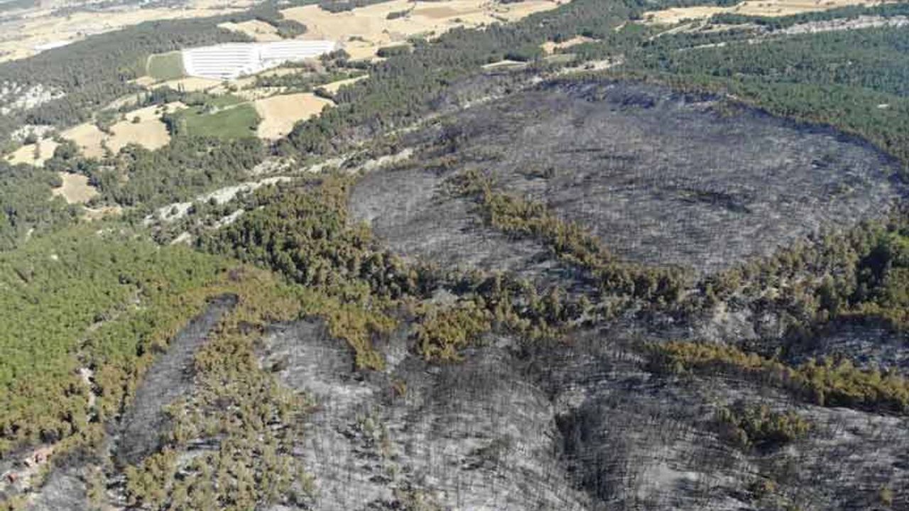 Yangının etki ettiği geniş alan, havadan dronla görüntülendi. Alevlerin küle çevirdiği ormanlık alanın bir kısmı yeşil bir kısmı ise siyaha döndü. Ateş savaşçılarının, çoğu bölgede soğutma çalışmaları sürüyor.