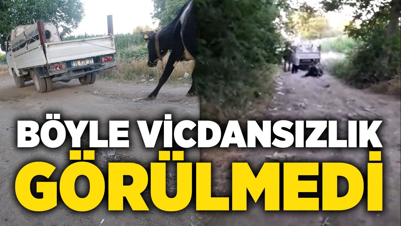 Bursa'nın İnegöl ilçesinde vicdanları sızlatan bir olay yaşandı. Bir sürücü, kamyonetin arkasına bağladığı büyükbaş hayvanı yol boyunca sürükledi. Yorgunluktan yere yığılan hayvanı ise sopayla döverek ayağa kaldırmaya çalıştı. O anlar amatör bir kamera tarafından saniye saniye kaydedildi.