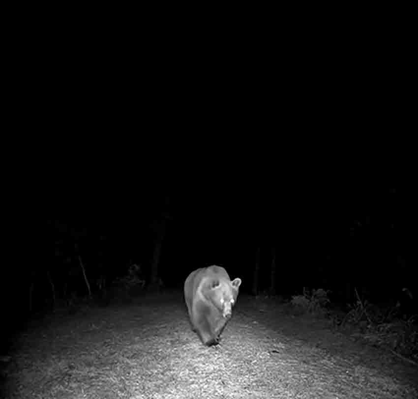 Kurulan fotokapan, gece saatlerinde bölgeden geçen boz ayıyı kaydetti. Görüntülerde ayının bir süre ormanda dolaştığı anlar yer aldı.