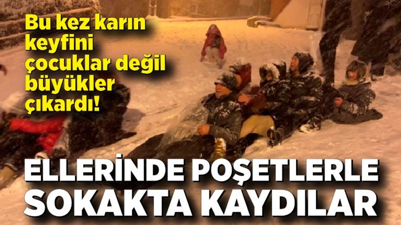 Samsun'da akşam saatlerinde etkili olan yoğun kar yağışı sonrası vatandaşlar, ellerine aldıkları poşetlerle kayarak karın tadını çıkardı.