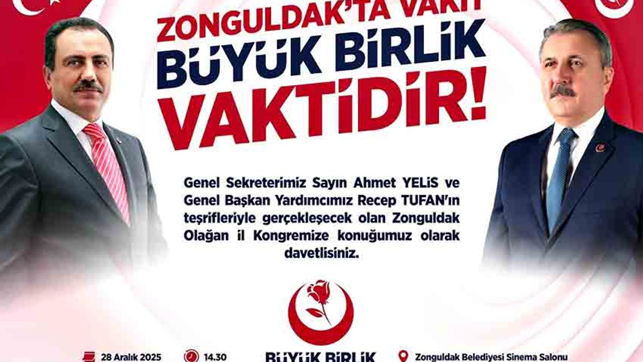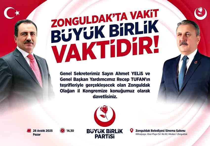 Büyük Birlik Partisi Zonguldak İl Kongresinin 28 Aralık 2025 Pazar günü yapılacağı bildirildi.