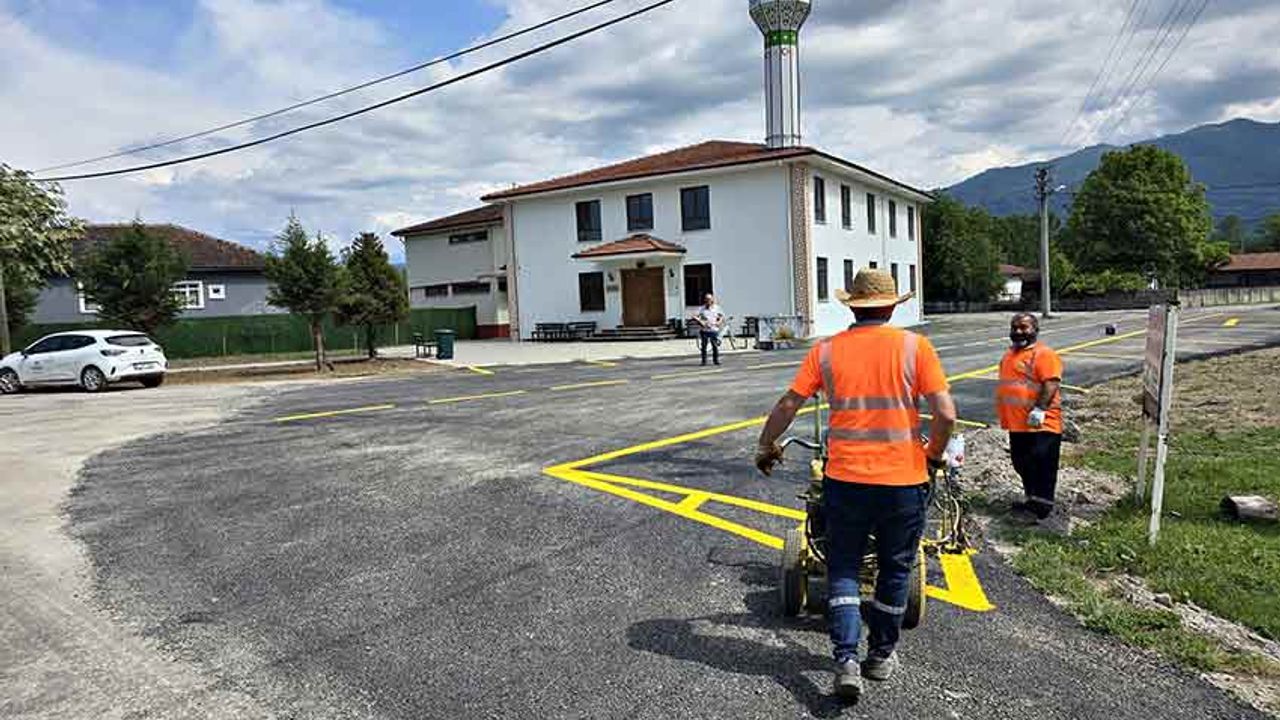 Düzce'de yeni yapılan yapıların çevre düzenleme çalışmaları sürerken, Yenikaraköy Cami çevresinde asfaltlamanın ardından araç park çizgi çalışmaları tamamlandı.