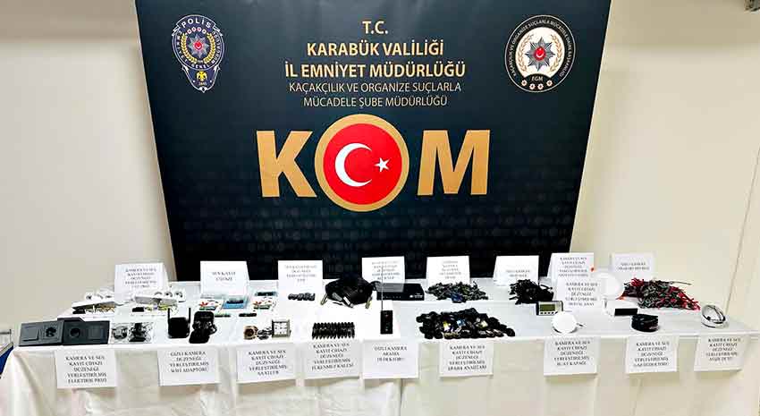 Karabük İl Emniyet Müdürlüğü Kaçakçılık ve Organize Suçlarla Mücadele (KOM) Şube Müdürlüğü ekiplerince yürütülen açık kaynak araştırmaları sonucu internette "casus kamera" olarak tabir edilen ve satışı yasak olan cihazların Karabük üzerinden satışının yapıldığı tespit edildi. Yürütülen teknik takip ve istihbari çalışmalar sonucunda söz konusu kameraların satışını gerçekleştirdiği belirlenen E.İ. isimli şüpheliye yönelik Karabük Cumhuriyet Başsavcılığı koordinesinde operasyon düzenlendi. Şüphelinin ikametinde yapılan iki ayrı aramada 1 adet gizli kamera bulma dedektörü, 12 adet kamera ve ses kayıt düzeneği yerleştirilmiş tükenmez kalem, 5 adet priz görünümlü gizli kamera, 10 adet ses kayıt cihazı yerleştirilmiş USB bellek, 258 adet anahtarlık içine gizlenmiş kamera ve ses cihazı, 5 adet üçlü priz görünümlü kamera düzeneği, 2 adet Wi-Fi adaptörü içine yerleştirilmiş kamera, 1 adet avize duyu içine yerleştirilmiş kamera, 1 adet masa saati, 1 adet buvat kapağı, 1 adet gaz dedektörü, 1 adet araba anahtarı, 1 adet spot LED lamba içine gizlenmiş kameralar, 1 adet receiver kumandası, 1 adet dijital saat içine yerleştirilmiş kamera, 2 adet susta tipi ve 4 adet yaka tipi kamera ile kamera yapımında kullanılan 120 elektronik devre, 185 anakart devresi, 175 devre anteni, 208 kamera, 550 aç-kapa anahtarı, 42 batarya ve çok sayıda duman dedektörü, powerbank, masa saati, oda kokusu, müzik kutusu, ses bombası, termometre, yaka düğmesi, büst ve heykelcik ile hesap makinesi ele geçirildi.