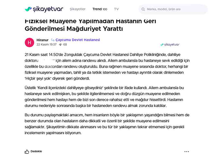 Hiranur, dahiliye doktoru için özellikle randevu oluşturduklarını iddia ederek ‘sikayetvar’ adlı sitede şu ifadelere yer verdi: