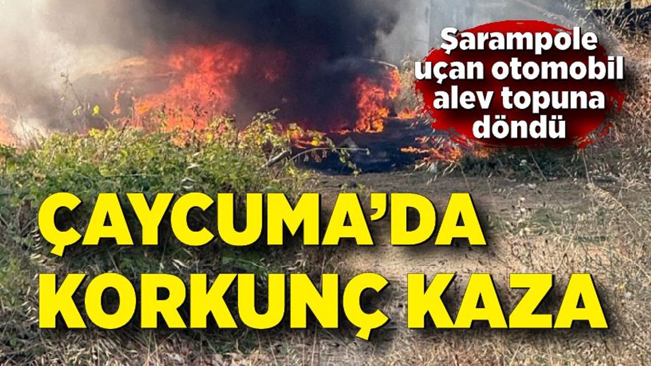 Zonguldak'ın Çaycuma ilçesinde bir otomobil, başka bir otomobile çarptıktan sonra şarampole uçtu. Kazada otomobil alev topuna dönerken, sürücü alevlerin arasında kalmaktan son anda kurtuldu.