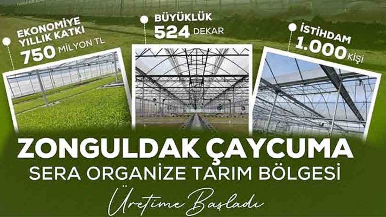 Bakan Yumaklı, yaptığı yazılı açıklamada, "Zonguldak Çaycuma Sera Organize Tarım Bölgesi artık üretimde. Yılda 750 milyon TL ekonomiye katkı sağlayacak bu proje, bölge ekonomisine can, ülkemize güç katacak. Hayırlı olsun" ifadelerine yer verdi.