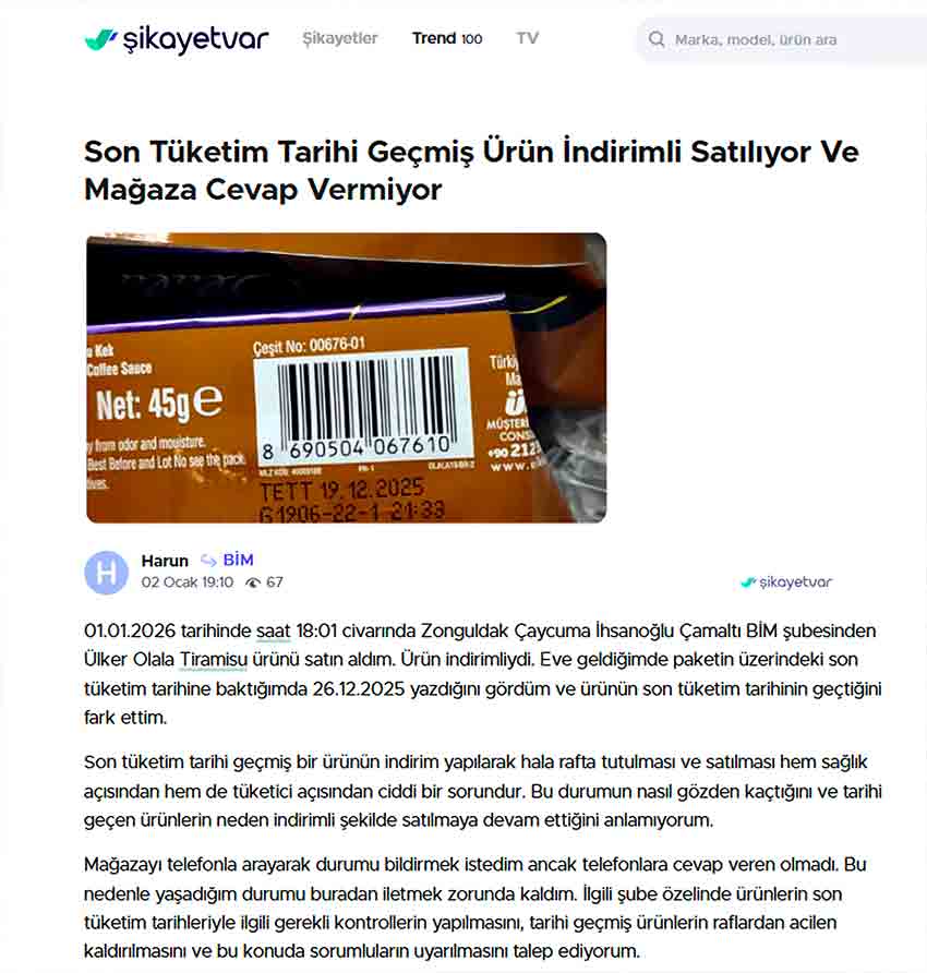 Harun, ilgili şube özelinde ürünlerin son tüketim tarihlerine yönelik kontrollerin artırılmasını, tarihi geçmiş ürünlerin raflardan derhal kaldırılmasını ve sorumluların uyarılmasını talep etti.