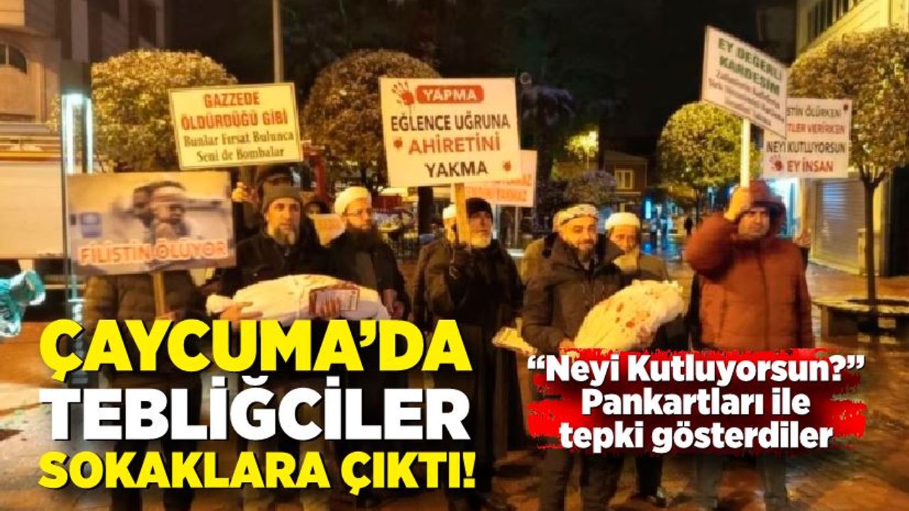 Grup ayrıca ellerinde taşıdıkları pankartlarla Filistin’de yaşananlara da dikkat çekti. “Filistin ölürken neyi kutluyorsun?”, “Eğlence uğruna kendini yakma” ve “Ey değerli kardeşim” yazılı pankartlar taşıyan tebliğciler, yılbaşı kutlamalarının yerine mazlum coğrafyalara duyarlılık çağrısında bulundu.