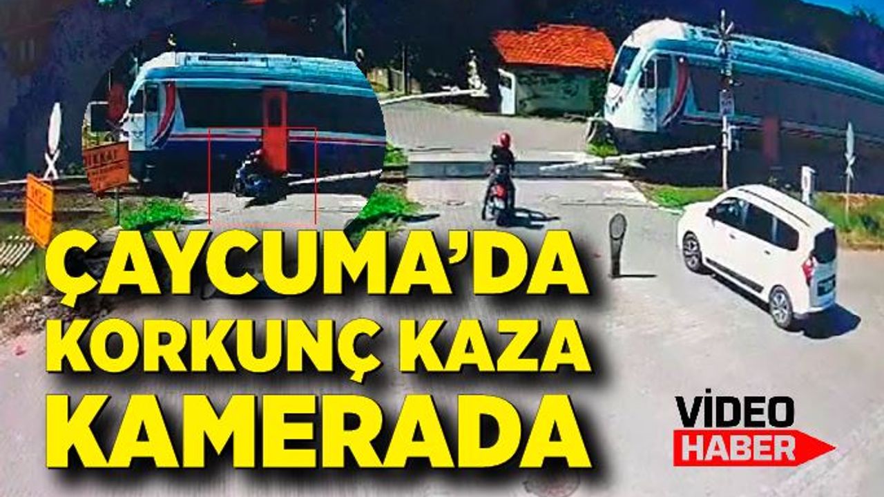 Zonguldak'ın Çaycuma ilçesinde hemzemin geçitten geçmeye çalışan motosiklete yolcu treni çarptı. Motosiklet sürücüsünün hafif şekilde yaralandığı kaza güvenlik kamerasına yansıdı.