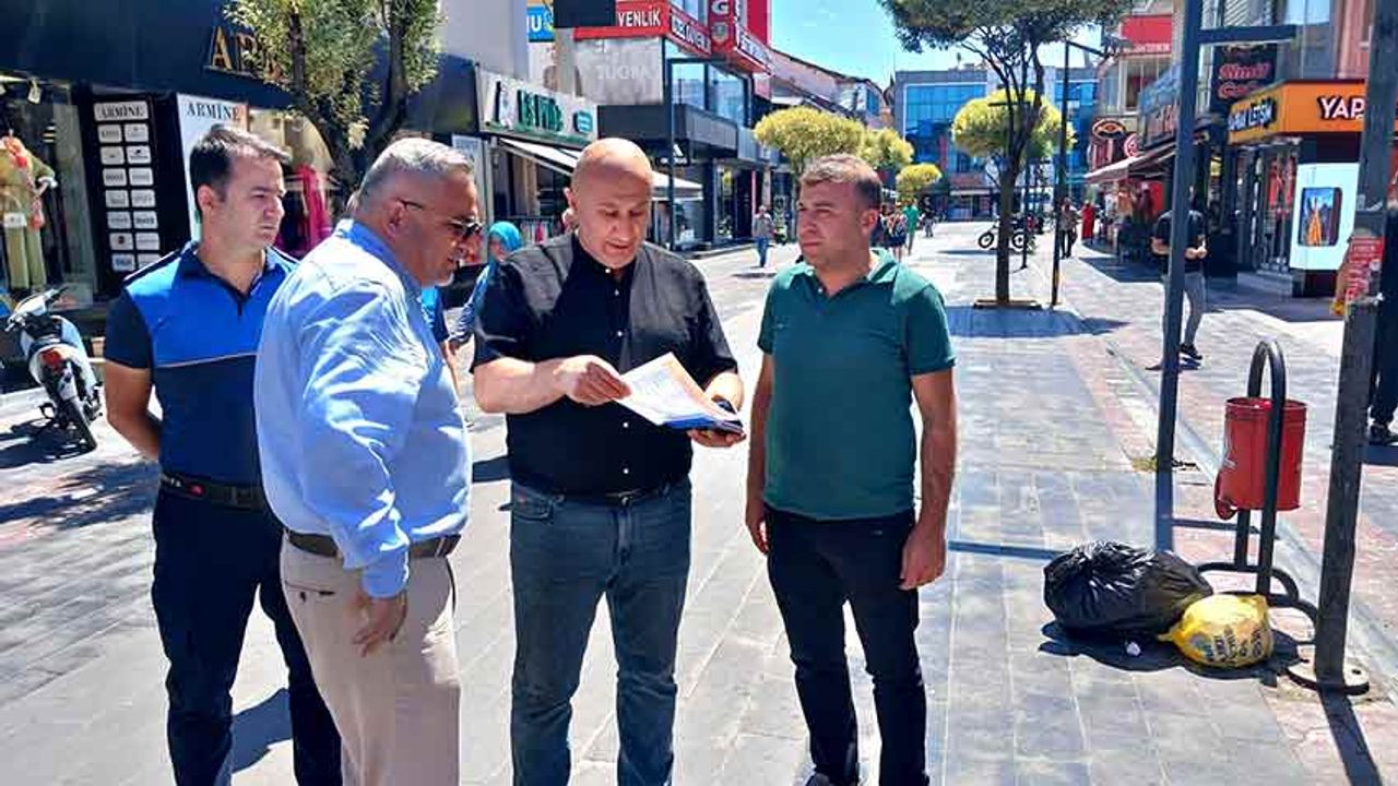 Belediye Başkan Yardımcısı Mehmet Saygun, Temizlik İşleri Müdürü Mehmet Emin Tangüner ve zabıta ekipleri, sahaya inerek merkezde esnaflarla birebir görüşmeler yaptı. Görüşmelerde, çevre temizliği konusunda daha duyarlı olunması yönünde çağrılar yapıldı.