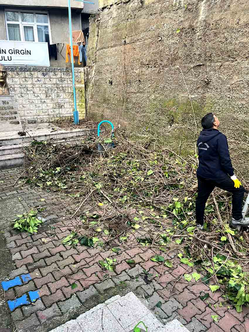 Çınartepe Muhtarı Melih Köse Hüseyin Girgin Okulu önü ve çevresinde kötü görüntü oluşturan ot ağaçlarda budama ve temizlik çalışması yaptı.