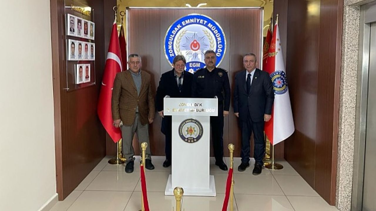 Zonguldak Esnaf Odası Birliği Başkanı Muharrem Coşkun beraberinde Pazarcılar Odası Başkanlığına seçilen Tunay Küçük ve yönetim kurulu üyesi Yakup Fidanboy ile birlikte İl Emniyet Müdürü Fahri Aktaş’a ziyarette bulundular.