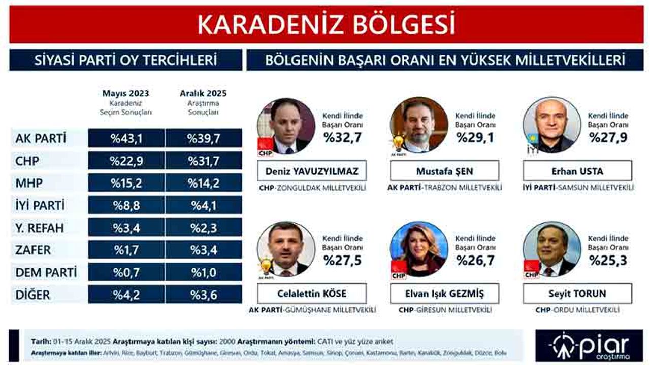 1–15 Aralık 2025 tarihleri arasında, 2 bin kişiyle CATI ve yüz yüze görüşme yöntemiyle gerçekleştirilen araştırmaya göre, Karadeniz Bölgesi’nin başarı oranı en yüksek milletvekili bir kez daha CHP Genel Başkan Yardımcısı ve Zonguldak Milletvekili Deniz Yavuzyılmaz oldu.