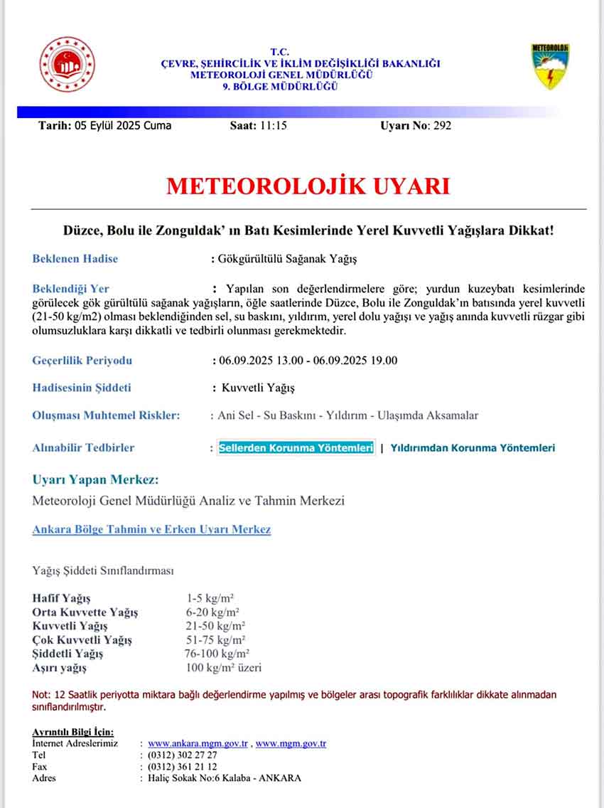 Resmi uyarı metni şu şekilde paylaşıldı: “Yapılan son değerlendirmelere göre; yurdun kuzeybatı kesimlerinde görülecek gök gürültülü sağanak yağışların, öğle saatlerinde Düzce, Bolu ile Zonguldak’ın batısında yerel kuvvetli (21-50 kg/m²) olması beklendiğinden;