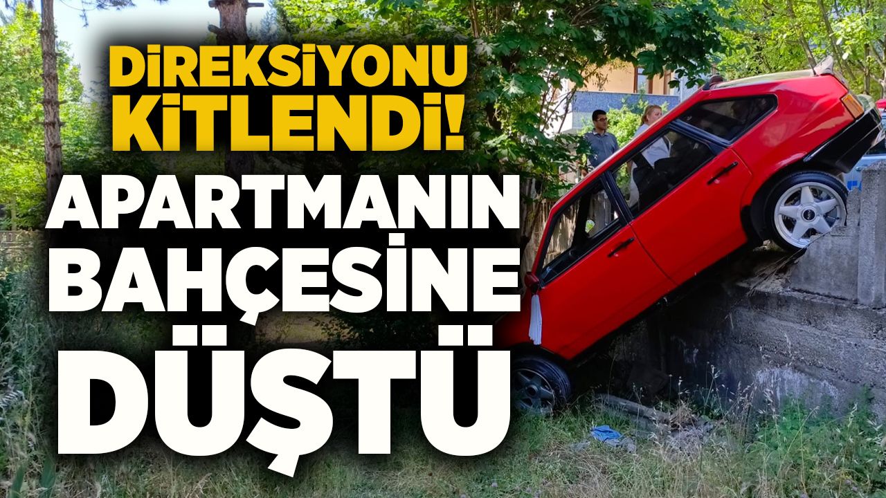Karabük'ün Safranbolu ilçesinde iddiaya göre direksiyonu kilitlenen otomobil kontrolden çıkarak bir apartmanın bahçesine düştü.