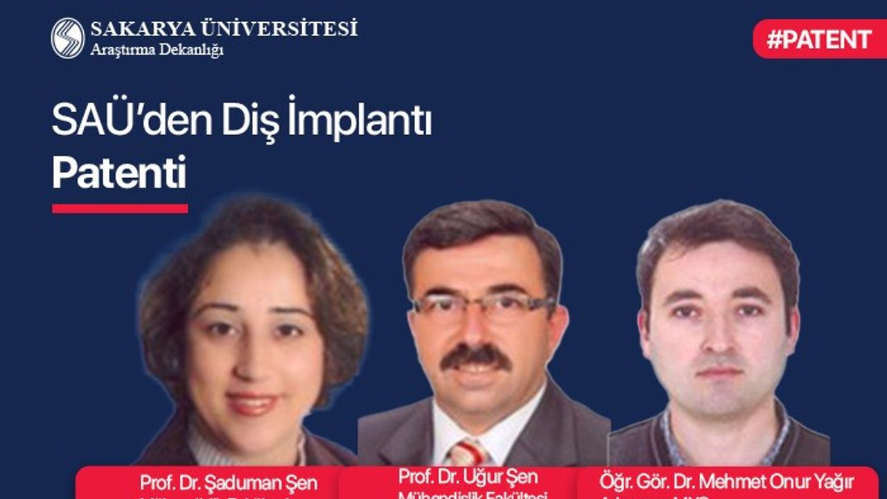 Sakarya Üniversitesi Mühendislik Fakültesi Öğretim Üyeleri Prof. Dr. Şaduman Şen, Prof. Dr. Uğur Şen ve Adapazarı MYO Öğr. Gör. Dr. Mehmet Onur Yağır'ın geliştirdiği "Diş İmplantı Komplesinde Gerçek Diş Elasto-plastik ve Sınırlı Visko-elastik Hareketine Uyumlu Küresel ve Eliptik Geometrili Abutment Kullanımı" başlıklı patent başvurusu tescil edildi.