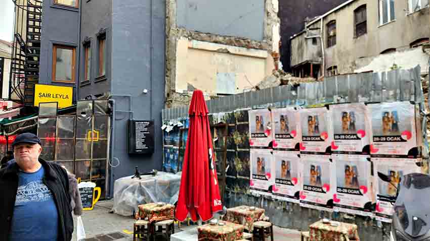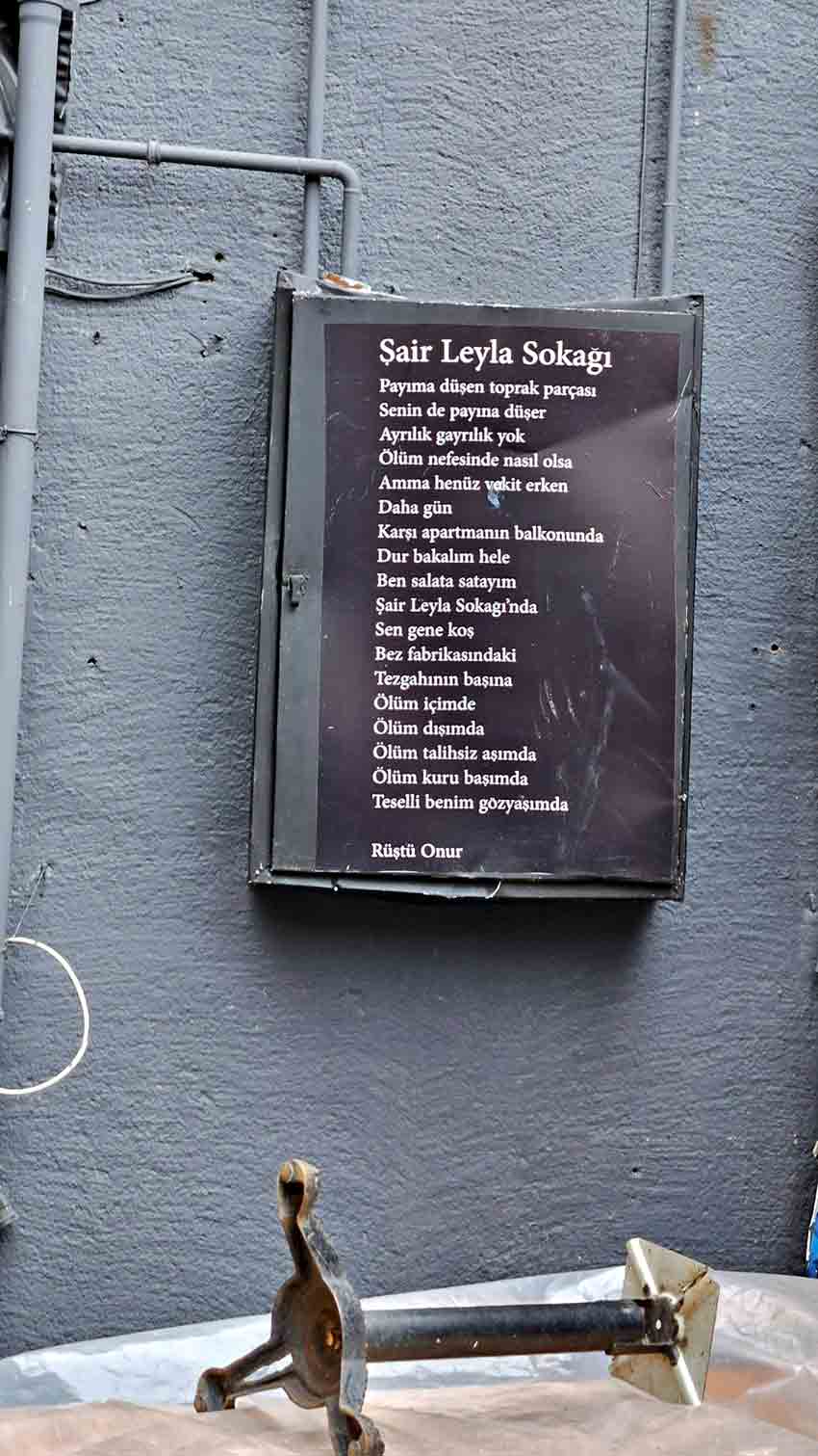 “İstanbul'a her geldiğimde Beşiktaş Çarşısı'nda, Şair Leyla Sokağı'nda bulunan Beşiktaş Köftecisi benim en favori uğrak yerlerimdendir. Mekanın tam karşısında metal paravanla çevrilmiş bina enkazı yıllardır öylece durur. Bina enkazının devamında iki isme ait görüntü göze çarpar. Biri sokağa adını veren "Şair Leyla Sokağı" tabelası, öbürü Devrekli şair Rüştü Onur'un bir şiirinin yazılı olduğu oldukça eski bir duvar. Fakat yazı da duvar kadar eskiydi ki iyice silikleşmişti.